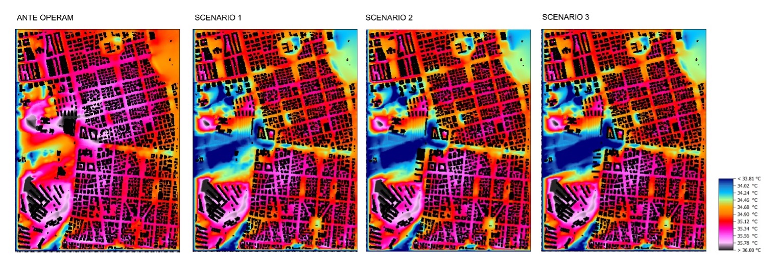 Il modello per le simulazioni microclimatiche degli scenari progettuali è stato realizzato con il software ENVI-met: il lavoro di modellizzazione è stato concepito fin dal principio strumento di supporto critico e di verifica delle ipotesi progettuali, e non come dispositivi prescrittivi in grado di sostituirsi al processo di progetto progettuale. Le simulazioni sono state organizzate secondo due livelli di approfondimento, corrispondenti a due diverse scale di osservazione e intervento. Il modello a larga scala è stato costruito con una griglia spaziale di 4×4×4 metri: include l’intero ambito di studio, che comprende uno dei grandi vuoti urbani presenti in quella porzione di territorio, il tessuto edificato incluso nel perimetro definito da quattro arterie molto importanti (via della Primavera/via Tor De’ Schiavi, viale Palmiro Togliatti, via Casilina e via Prenestina) e il sistema degli spazi aperti presi in esame. A integrazione di questo, sono stati realizzati due modelli a scala più ridotta, costruiti su una griglia spaziale più fine di 2×2×2 metri, finalizzati alla verifica puntuale degli effetti microclimatici degli interventi progettuali sulle piazze oggetto di approfondimento: Piazza delle Gardenie e Piazza dei Mirti.