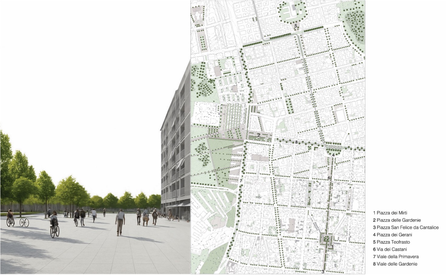L’obiettivo delle strategie progettuali proposte non si limita alla mitigazione delle isole di calore: le trasformazioni del paesaggio urbano diventano anche l’occasione per costruire nuove relazioni e rafforzare quelle esistenti tra lo spazio vegetato residuale — esito della stratificazione storica di progetti attuati e non — e lo spazio pubblico. Una delle principali azioni progettuali riguarda il ridisegno delle strade e della mobilità carrabile, con l’intento di trasformare la rete infrastrutturale in un sistema reticolare di sfondo capace di tenere insieme e connettere il tessuto urbano denso e consolidato con il contesto più ibrido e frammentato della campagna romana. A una scala di maggior dettaglio, il progetto si interroga sulla qualità dello spazio aperto pubblico, sulla sua vivibilità e accessibilità e sulle funzioni che accoglie. Nell’ambito della strategia generale emergono due piazze di particolare rilevanza che sono state oggetto di approfondimenti progettuali specifici: Piazza dei Mirti e Piazza delle Gardenie.
